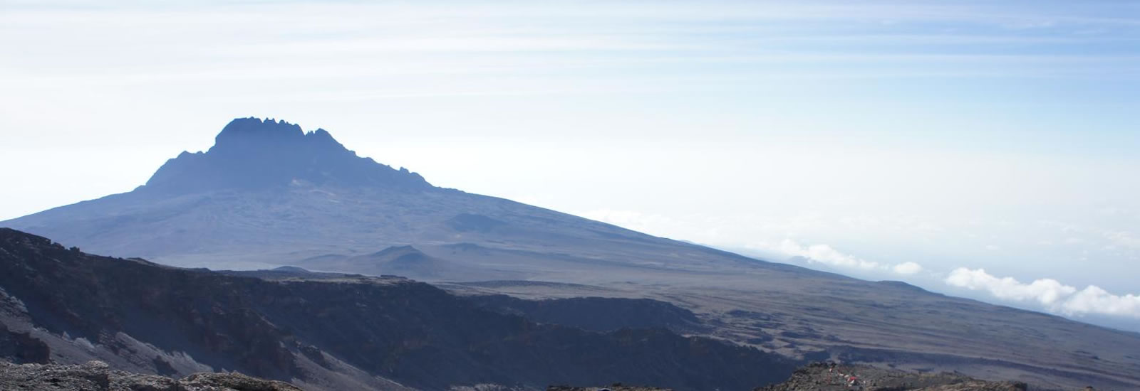 Kilimanjaro marangu route Tanzania Ascending, we now pass the last watering point, walking onto the saddle of Kilimanjaro between the peaks of Kibo and Mawenzi. Vegetation begins with upper heath-land but then disappears into “moonscape”. Dinner, rest, and prepare for summit climb.